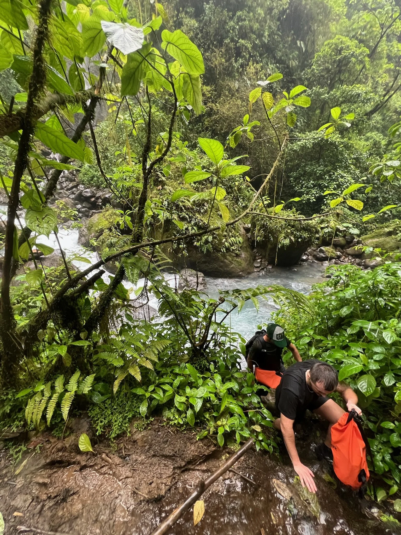 A stretch of moderate trail climbing through mossy rock and untamed jungle leads us to our first river crossing. He helps Lauren across first, guiding her foot placement through thigh-high river currents. It’s becoming pretty clear that this is going to be a wet hike.